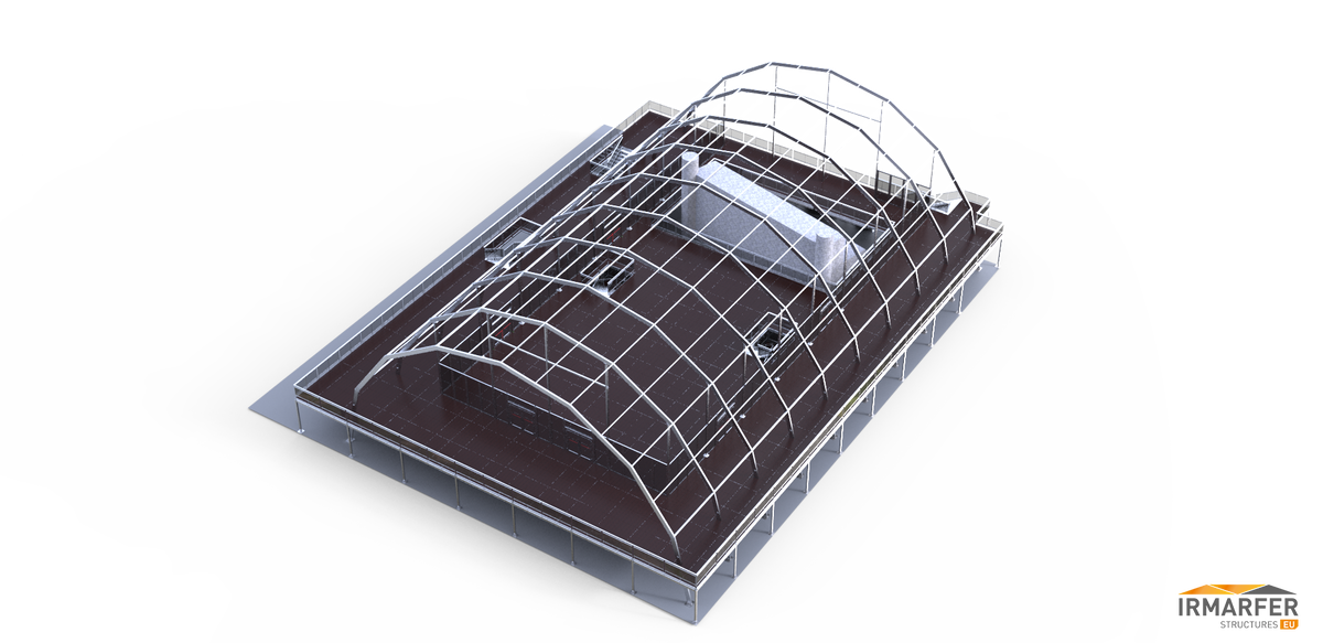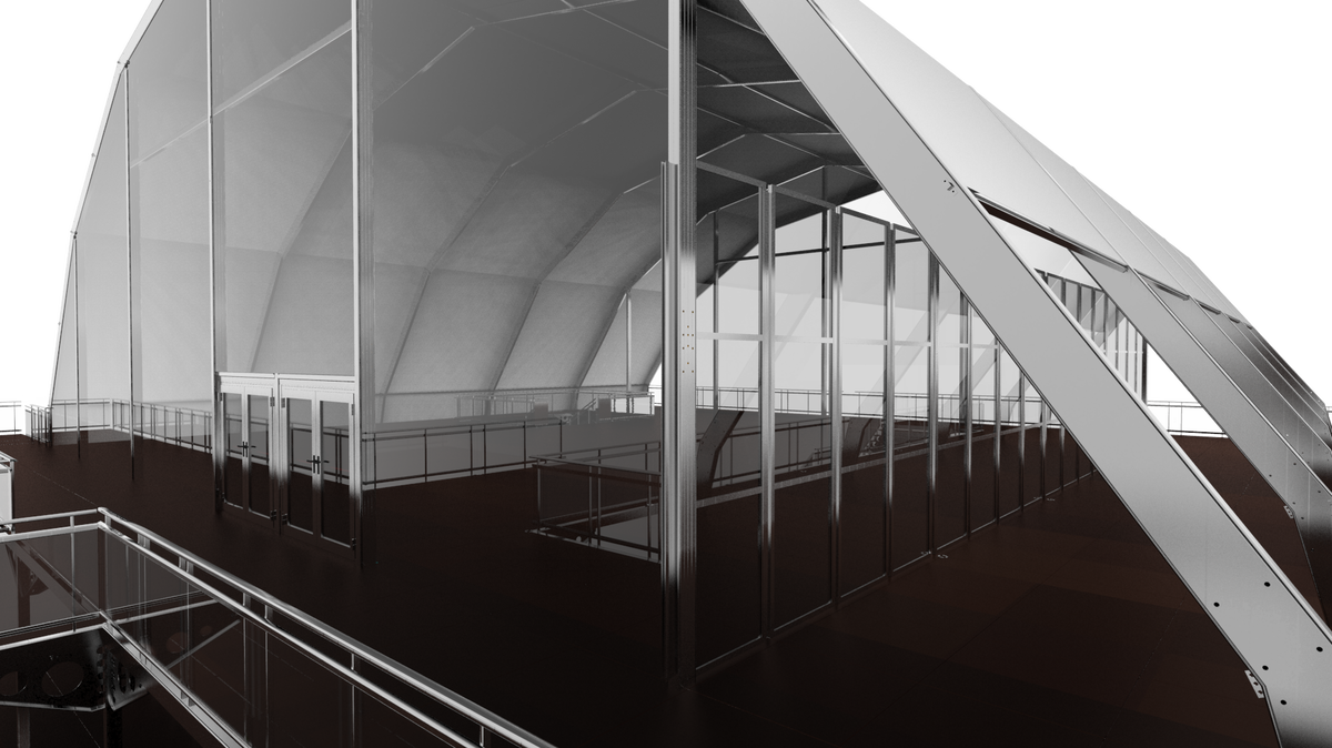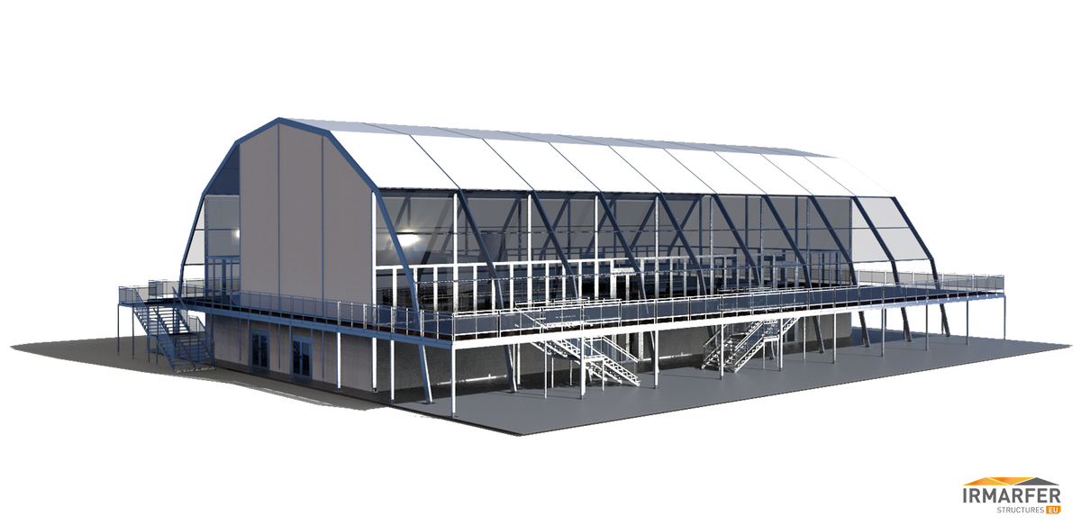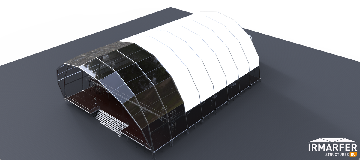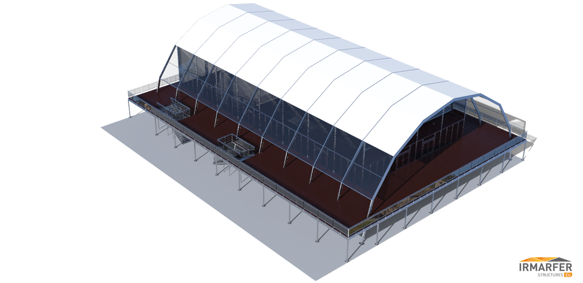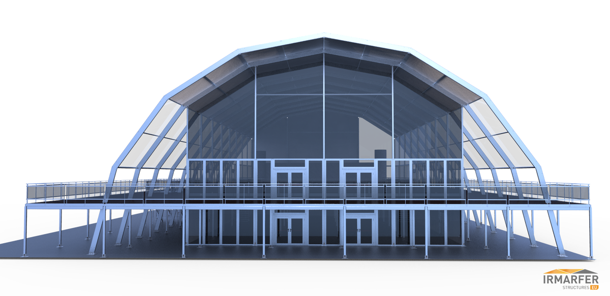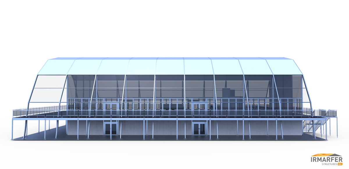 je nach Anforderung des Kunden können wir die Dachmembranen (Transparent & Opac) kombinieren. Innenmaß dieser Struktur (EG + OG) 20 x 40m + 3 seitige Außenterrasse á 5m Breite. Seitliche Elemente auch Echtglas und Doppeltürelemente.