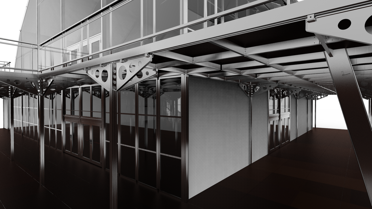 Dank dem 2,5m / 5m / 7,5m Rastermaß unseres Stock-Systems können Sie den Bereich im EG als Bar / Backoffice / Sanitärbereiche und das OG als VIP Bereich, o.ä. verwenden.