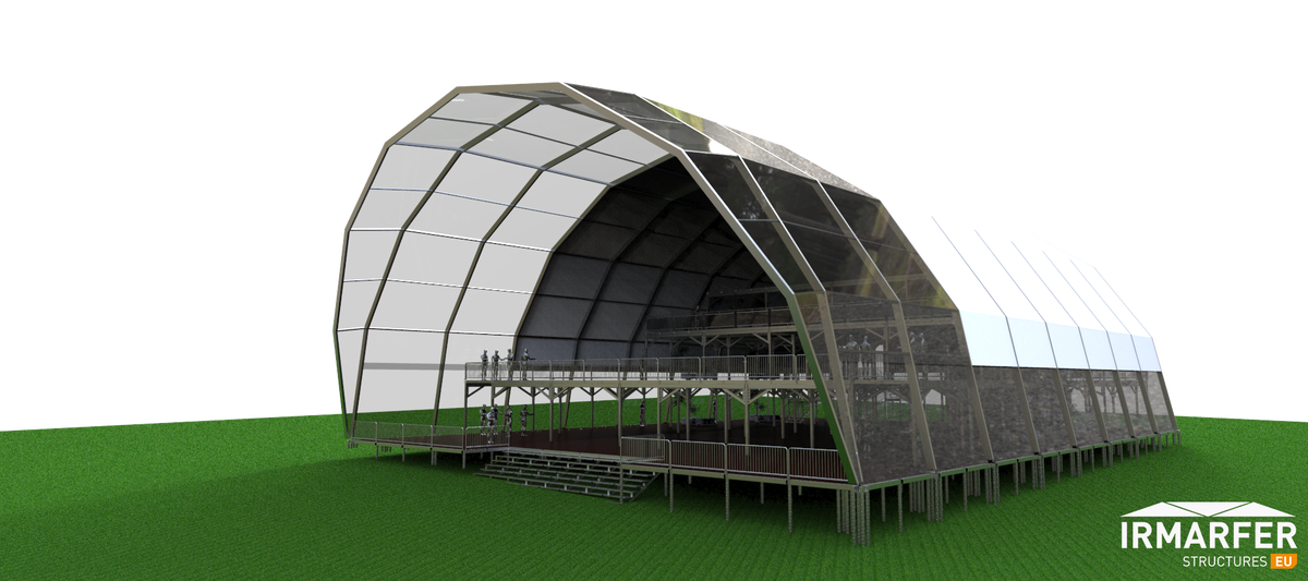 Die Dome Struktur ist hier in folgenden Größen erhältlich (20/25/30/40m Durchmesser), welche in Kombination mit unserem höhenverstellbarem Bodensystem zum VIP Bereich der besonderen Art verwandelt wird.